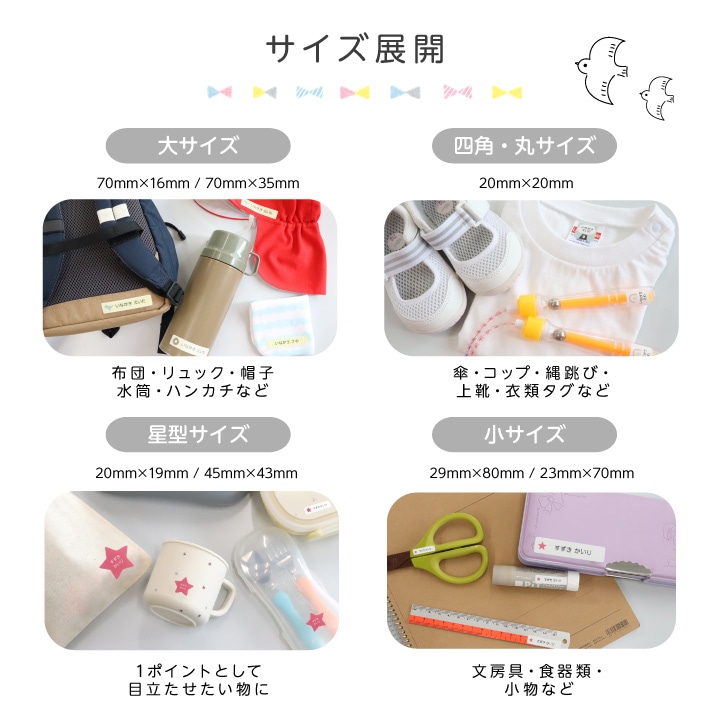 | アイロン不要で手間いらずなお名前シール登場。 特殊な強力接着剤であらゆる素材にも対応。 プラスチックはもちろん布やシリコンにも◎ 耐水耐熱で機能性も抜群。 貼り方も簡単だから忙しいママにもお勧め。 お洒落なデザインで入園入学準備も楽しめます。 デザインは、全10種類ご用意。 ------------------------------------------------------------------------------ 01.パステルピンク 02.パステルイエロー 03.パステルブルー 04.パステルグリーン 05.グレー 06.ホワイト 07.くすみピンク 08.くすみブラウン 09.くすみブルー 10.くすみグリーン ------------------------------------------------------------------------------ 【印字内容について】 当商品ページに入力欄がございます。 印刷するお名前は、そちらへご入力下さい。 ※フルネームの場合、名字と名前の間に半角スペースが入ります。 ※表記するお名前は、ひらがな・漢字・ローマ字・数字が対応しています。 旧字の場合は、備考欄にてご指示ください。 例:高橋の高ははしごだかでお願いします。 ■国内自社製造 国内の自社工場で製造だから安心。 製造から梱包まで1つ1つ丁寧に行っています。 |